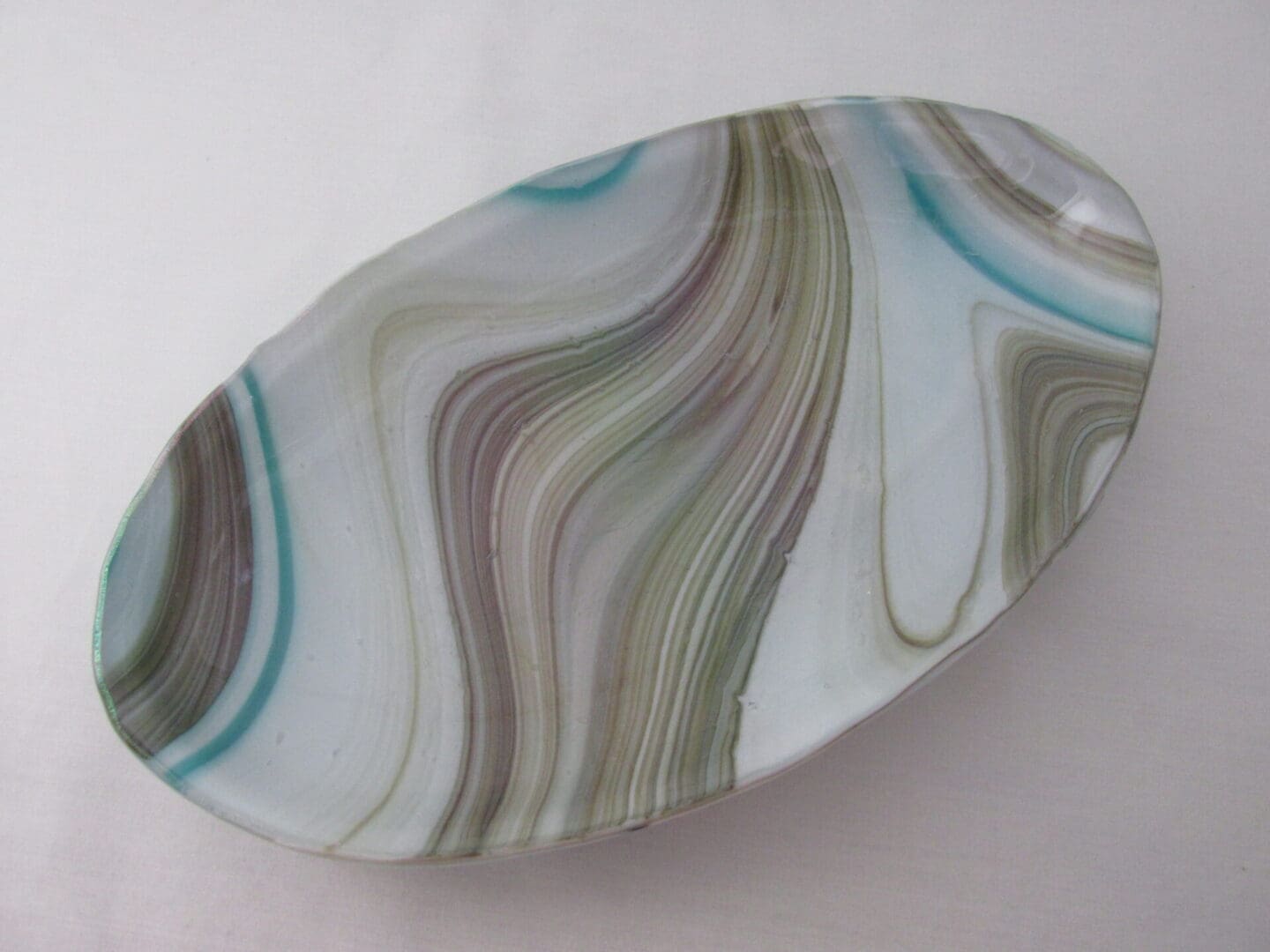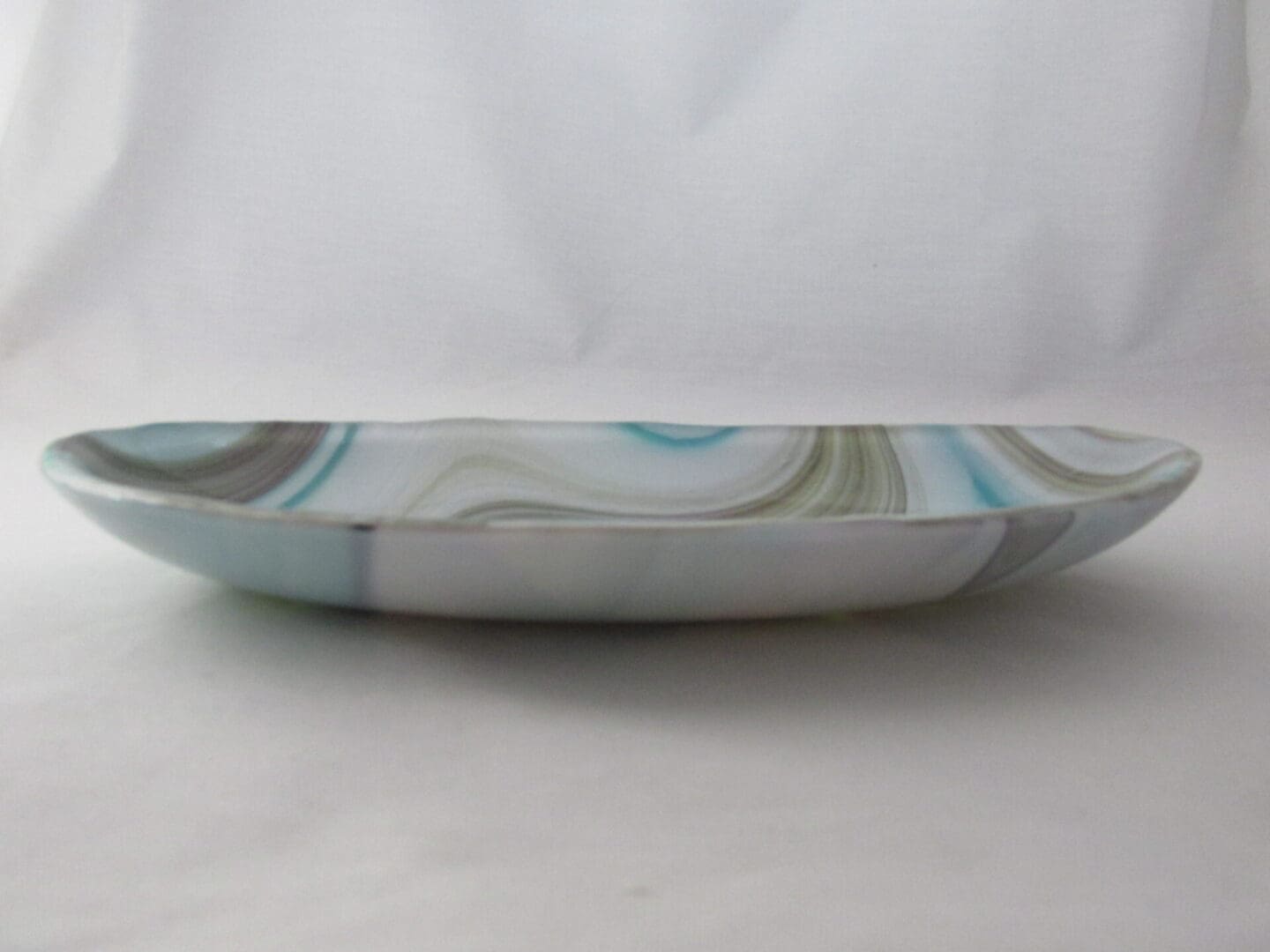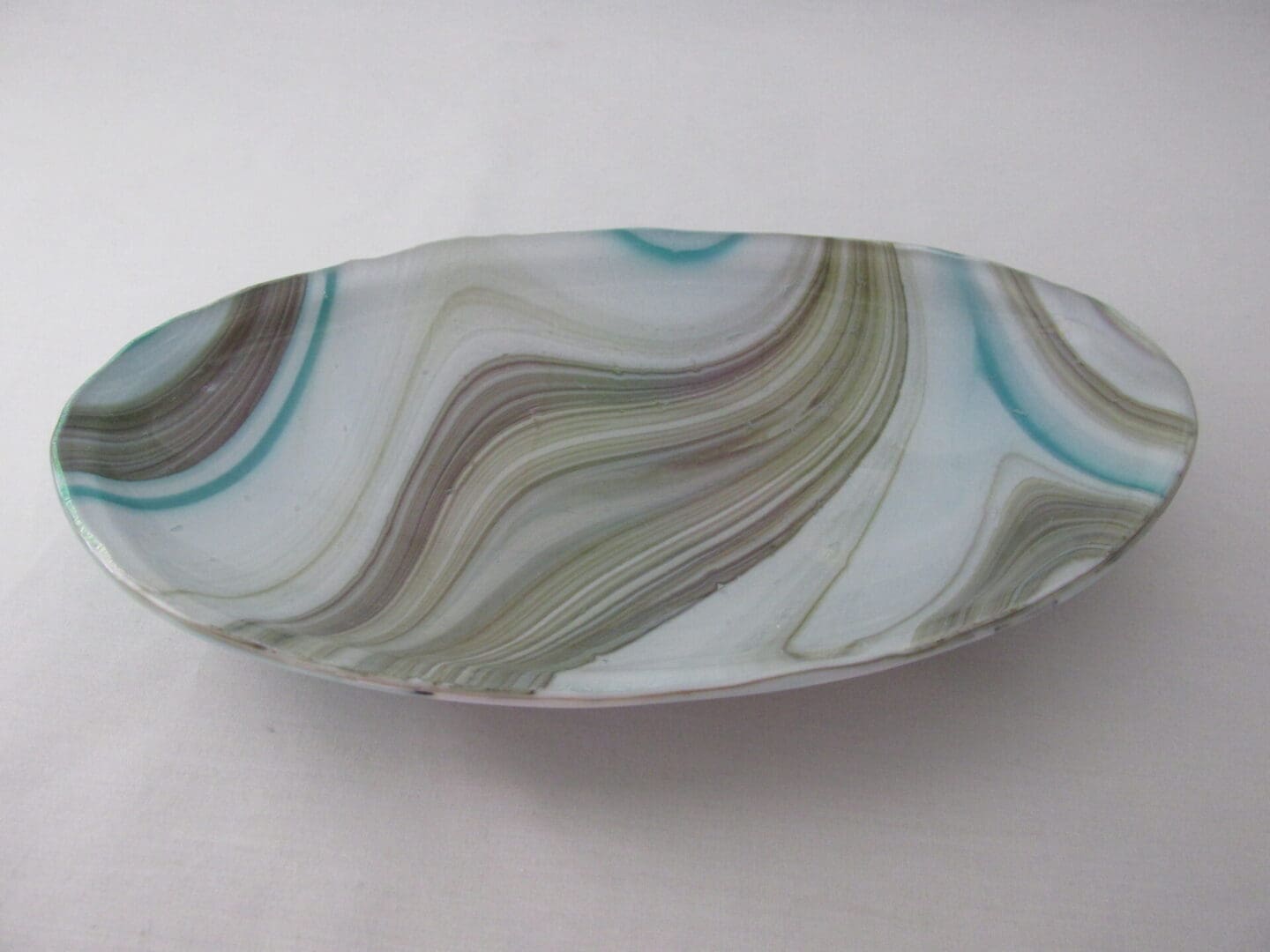 Teal and brown glass swirled with White and Mint overlaid with a clear iridized glass to add a special snap and sparkle. Impossible to see the iridized effect in the photos – definitely a must see in person. Use for steamed veggies, rolls, on the counter for keys & things or your dresser for watches, change or jewelry. Very multi functional. Limited supply in this glass (the glass is special pour by the manufacturer) glass making this a true collector’s piece. So get your collectible while you can!